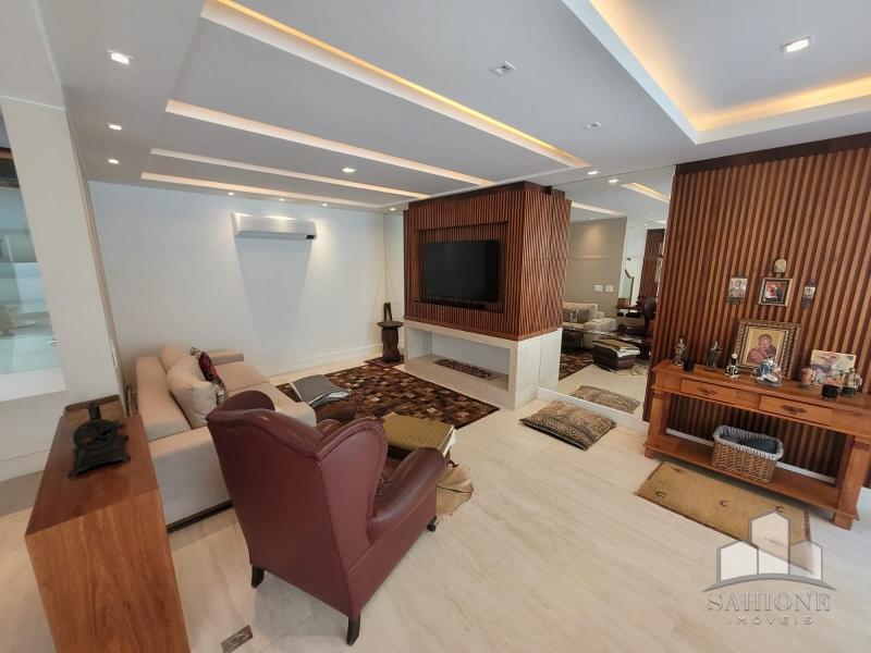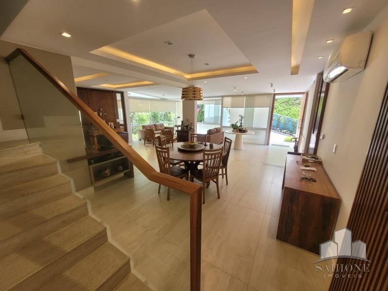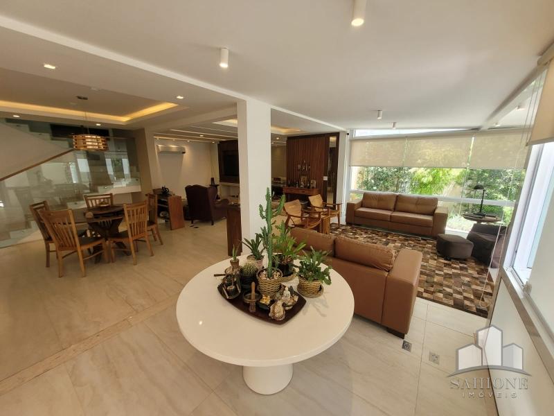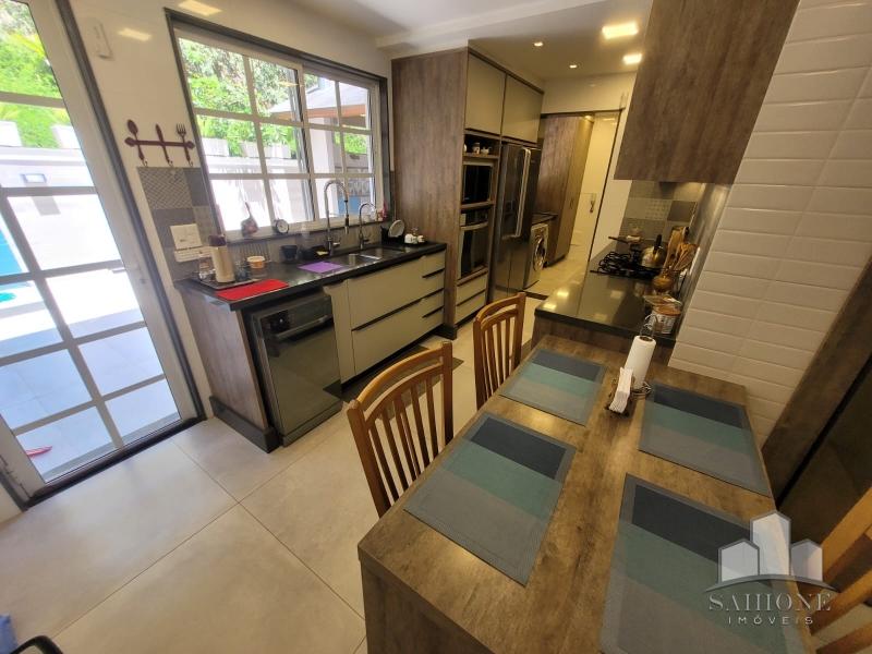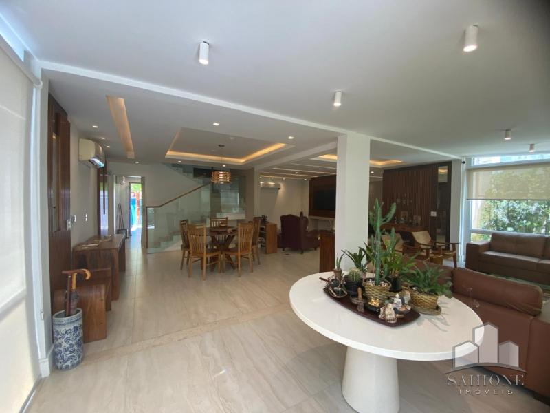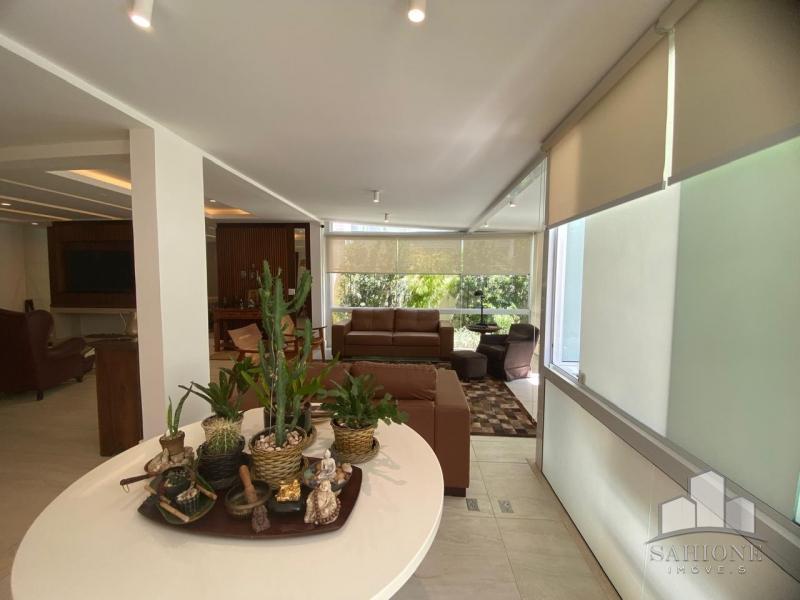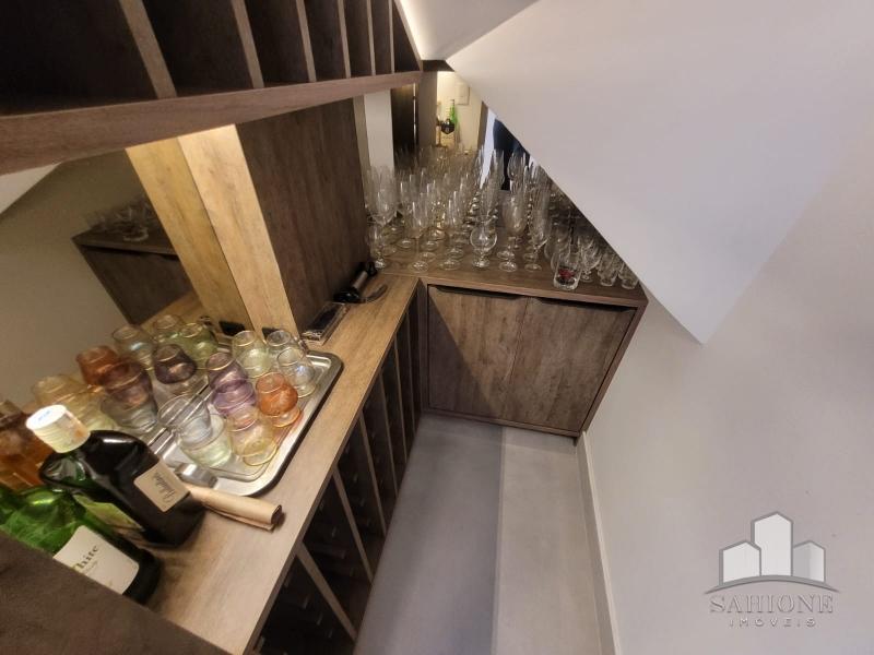 Constando no andar térreo: living, salão em três ambientes (TV, de estar com lareira e jantar) e lavabo, em um ambiente decorado com peças requintadas e muito bom gosto, harmônico, com uma arquitetura moderna e sofisticada. Cozinha e área de serviço planejadas com vários armários, adega e lavabo. Área gourmet com churrasqueira e chuveirão na área externa junto ao terraço, muito ensolarado.